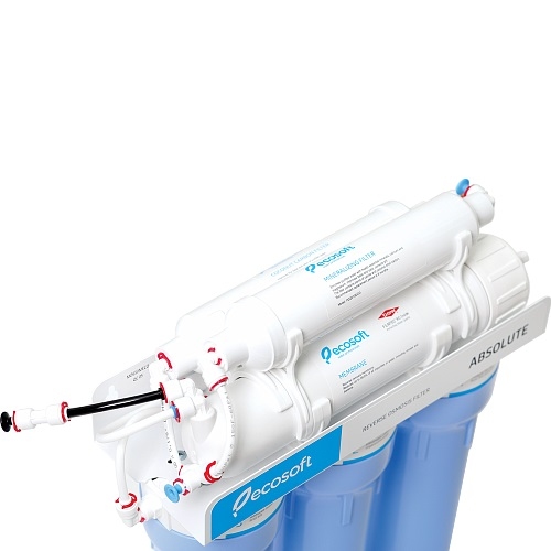 Ecosoft Absolute 6-50M это фильтр для воды с системой обратного осмоса, имеющий 5 ступеней очистки воды. Первая, вторая и третья ступень очистки это механические фильтры из вспененого полипропилена 5 мкм (для песка, ила, ), активированного угля (против хлора, фенола и примесей металлов), вспененного полипропилена с порами 1 мкм (финальная механическая очистка). Далее идёт мембрана обратного осмоса DOW Filmtec (срок службы до 1,5 лет) для тонкой очистки воды до состояния близкого к "химически чистому".Далее вода поступает в накопительный бак, после чего вода проходит через угольный фильтр из кокосовой стружки для восстановления вкусовых качеств воды и через префильтр минерализации. В отличии от Standard эта система комплектуется двойным краном и имеет гарантийный срок от производителя 36 месяцев. Кран «Модерн» может подавать обычную обратноосмотическую воду для приготовления пищи и минерализованную воду — для питья
