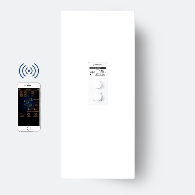 Электрический котел Kospel EKCO.M3 – 04/06/08 с погодозависимой автоматикой и возможностью управления системой отопления со смартфона. Котёл автоматически регулирует мощность погружных нагревателей в зависимости от потребности в тепле. В сочетании с накопителем горячей воды возможно регулирование температуры воды и включение циркуляционного насоса в соответствии с заданными дневными и недельными программами. Панель управления допускает диапазон температуры отопительной воды от 20 до 85 ° C.
