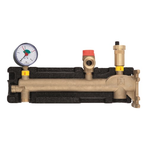 AFRISO GAK 50.Группа безопасности в изоляции с соединением для расширительного бака (до 50 л) для котлов до 50 кВт. Группы безопасности котлов предназначены для защиты системы отопления от превышения максимального допустимого рабочего давления и удаления воздуха из системы. Монтируются в вертикальном положении на подающем трубопроводе после котла. Между котлом и группой безопасности не должно быть запорной арматуры. Соединение резьбовое внутр. 3/4" Предохранительный клапан 3 бар, 1/2" х 3/4";