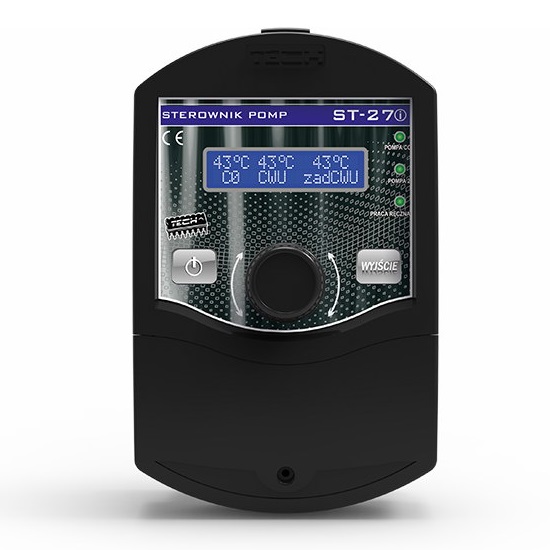Контроллер TECH ST-27i для управления циркуляционным насосом центрального отопления, а также дополнительным насосом (ГВС или тёплого пола). Задачей насоса является включение насоса центрального отопления, если температура пересечет пороговое значения включения и выключение, в случае, если котел остынет (в случае гашения). Для второго насоса, кроме температуры включения, пользователь устанавливает заданную температуру, до достижения которой насос будет работать.