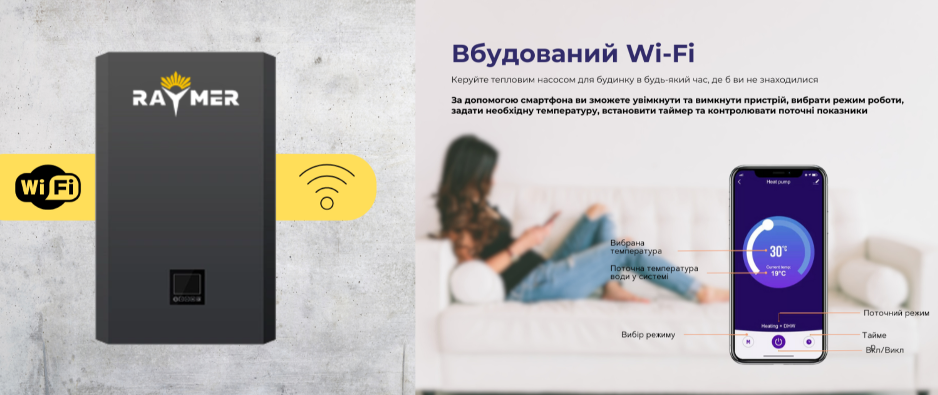 Вбудований модуль Wi-Fi дає змогу керувати роботою теплового насосу на відстані. Де б ви не були, ви можете увімкнути/вимкнути тепловий насос, а також відслідковувати його показники маючи доступ до інтернету.