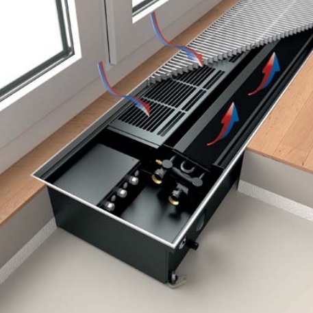 Холодный воздух помещения опускается вниз в канал конвектора. Воздух согревается теплообменником и устремляется вверх. Внутрипольные конвекторы, расположенные непосредственно перед окном или остеклёнными фасадами, создают своеобразную тепловую завесу, которая эффективно препятствует проникновению холодного воздуха в помещение.Принцип действия - Охлаждение